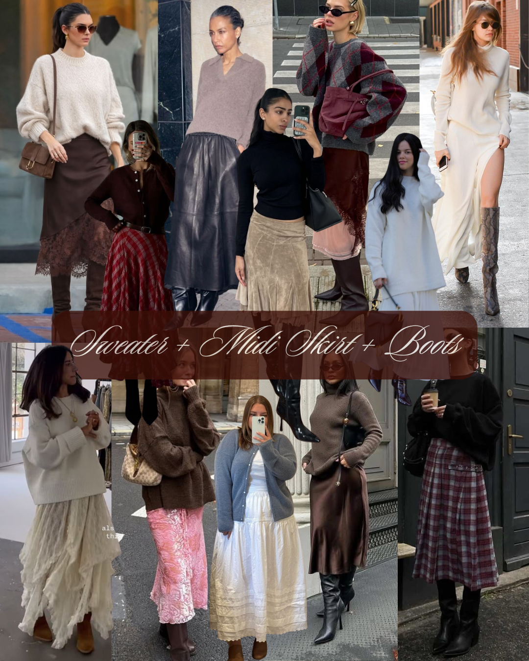 Outfit Formula 3: Sweater + Midi Skirt + Boots
