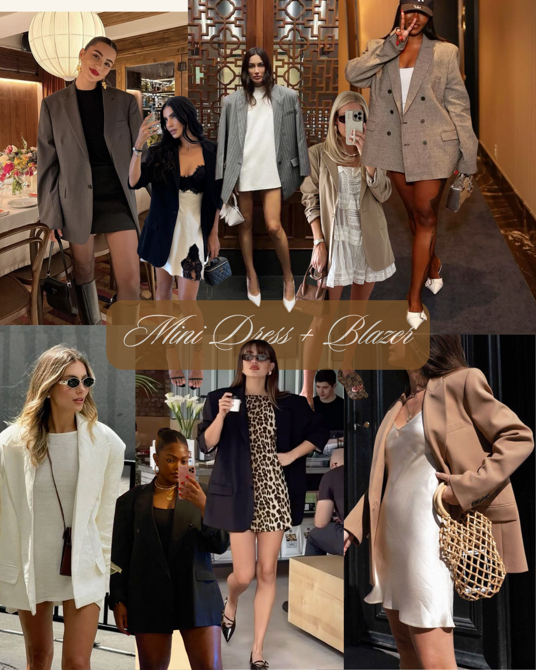 The mini dress brings the flirty, feminine energy, while the blazer adds structure and a modern edge. That contrast is what makes the outfit feel intentional instead of overly dressed up.